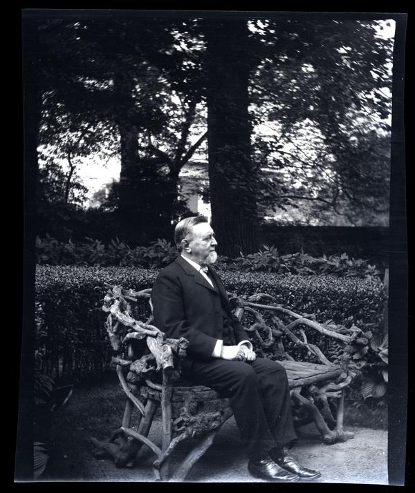 Film negative showing Marriott C. Morris' older father Elliston P. Morris seated on a wooden bench. He wears a three-piece suit and looks to the right. A manicured hedge and large trees stand behind the bench.
