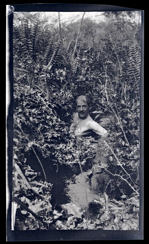 Film negative showing a man standing up to his chest in water. Ferns and other foliage surround the man, both in and out of the water.