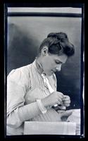 Film negative showing a woman bending over a project. The woman's hair is swept up on her head and she wears a pleated dress. A newspaper rests next to her