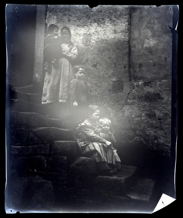 Film negative likely taken during Marriott C. Morris’ European honeymoon showing a woman holding a baby and three children on the steps outside a stone cottage, probably in England.