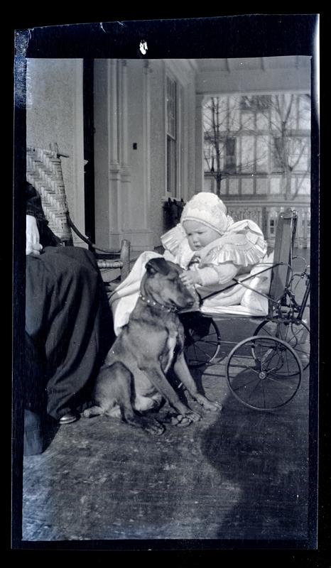 Film negative showing Marriott C. Morris' daughter Janet Morris as a baby in a carriage petting a dog at Morris' home at 131 W. Walnut Lane. Morris wears a white ruffled coat and cap. The medium-sized dog wears a studded collar. The skirt of a woman sitting in a chair is visible to the left.