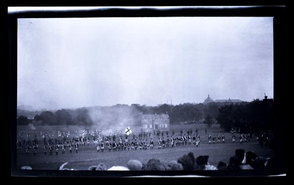 Film negative showing a group of people watching a performance occuring in a field below during the History Pageant at Fairmount Park, held October 7-12, 1912.