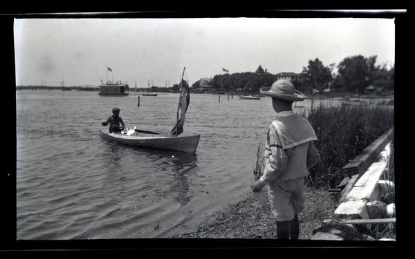 Film negative showing a boy paddling a rowboat, most likely on Wreck Pond at Sea Girt. Another boy watches from the shore nearby. The boy on the shore wears a sailor suit and a wide-brimmed hat.