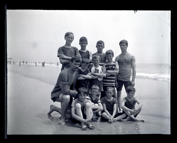 Film negative showing a group of men and boys from the Boys' Parlors Association posed in bathing attire at the Wildwood shore. The first row of boys sits in the sand, the man on the left kneels and the rest of the group stands. Founded in 1887, the Boys’ Parlors Association of Germantown served as a safe space for neighborhood children whose parents worked longer hours in an industrializing city. The name changed in 1907 to the Germantown Boys’ Club after joining ranks with the Boys and Girls Clubs of America. Marriott Canby Morris served as the president of the club in the first decade of the 1900s. Wildwood began developing as a coastal resort town in the 1890s, growing dramatically in popularity in the 1950s. The area was incorporated as a city in 1912.