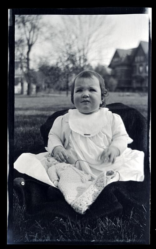 Film negative showing Marriott C. Morris' daughter Janet Morris as a baby sitting on a blanket in a garden. She wears a white dress and holds a doll wearing a knitted dress in her lap. A house is visible in the background.