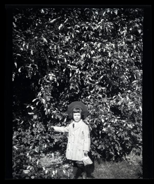 Film negative showing Marriott C. Morris' son Marriott Canby Morris Jr. as a boy wearing a coat and hat standing nex to a large shrub in the garden at their home at 6706 Cresheim Road. He wears a coat and wide-brimmed hat and closes his eyes to block the bright sun.