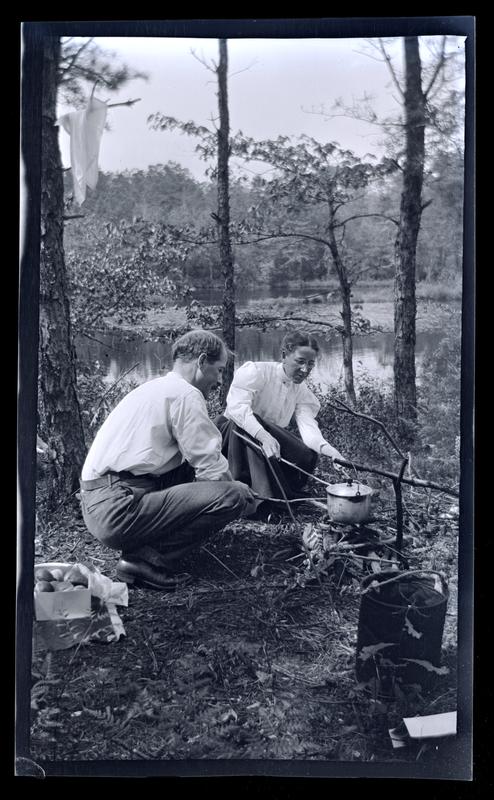 Film negative showing a man and woman crouched around a campfire near a river. A pot is suspended over the fire with two sticks. The woman wears a white blouse and long skirt.