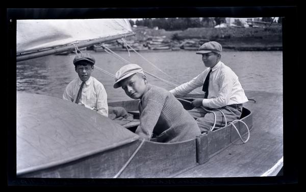 Film negative showing Marriott C. Morris' sons Elliston P. Morris Jr. and Marriott C. Morris Jr. and his third cousin twice removed Morris Wistar Wood as young boys on a sail boat on the Manasquan River near Brielle, NJ. They all wear caps.