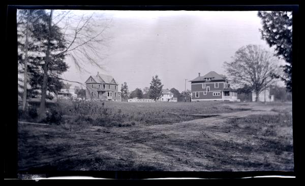 Film negative showing a series of two-story houses seen from a rough dirt road at Audubon, Pa. Trees stand on either side of the road, which is lined with wheel tracks.