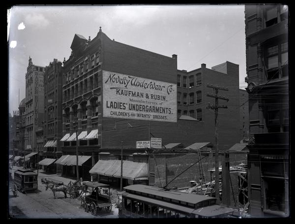 Glass negative showing the buildings on Arch Street, including Fairbanks Co. (701 Arch Street), Strouse & Co. building for sale (711 Arch Street), Rubin & Kaufman Novelty Underwear (715 Arch Street), I.S. Custer & Son & Co. (721 Arch Street), and the Baxter Building (733 Arch Street). 715 Arch Street has a sign that reads "Novelty Underwear Co., Kaufman & Rubin, Manufacturers of Ladies' Undergarments, Children's and Infants' Dresses." The lot next to the building is under construction. On the far left, 733 Arch Street has a sign that reads "Baxter Building." Horse-drawn carriages, pedestrians, and a trolley travel on the brick road below.