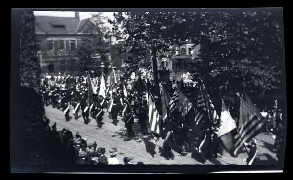 Film negative showing a group of uniformed men carrying American flags marching down a street in the 225th Anniversary parade of Germantown. Crowds gather on either side of the street. The Bicentennial anniversary parade celebrated the first German immigrants to America and the first thirteen Quaker families who founded Germantown. Most of the events were actually held in Philadelphia, and included the parade, concerts, religious services, and a ball. A smaller annual holiday, German Day, began to be held in subsequent years in German-American communities.
