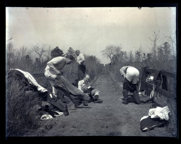 Film negative showing four men putting on clothes in the center of a dirt path at Egg Harbor. Various articles of clothing are strewn about the path and hung over the side of the wooden fences that line the road.