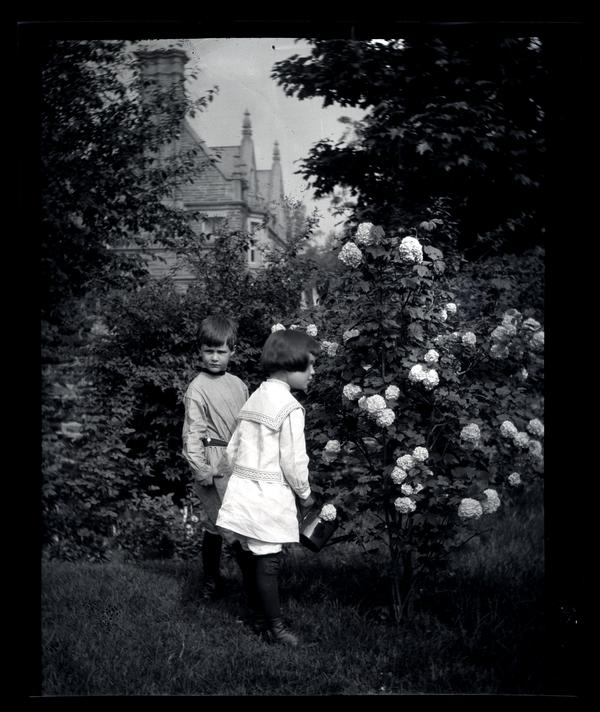 Film negative showing Marriott C. Morris' sons Elliston Perot Morris Jr. and Marriott Canby Morris Jr. as boys standing next to a large, flowering shrub in the garden at their home at 6706 Cresheim Road. Marriott Morris Jr. on the right holds a watering can and smells the flowers. Both boys wear sailor suits.