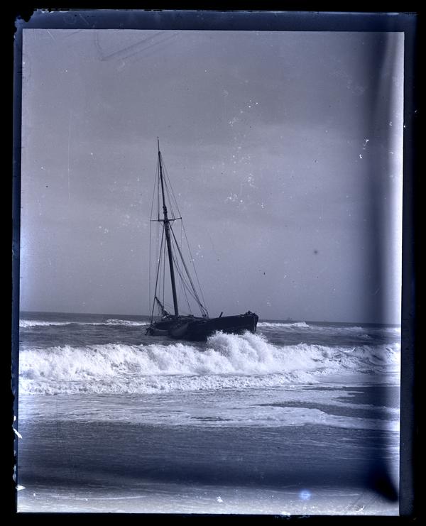 Glass negative showing the A.M.S. Taunton, a sailing ship with a tall mast moored in shallow water near the shore at Sea Girt. Waves crash around the ship onto the sand in the foreground.