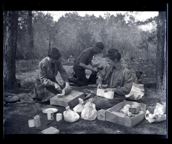 Film negative showing two women and a man kneeling on the ground surrounded by various boxes and packages at Egg Harbor. The woman on the left slices bread on a wooden box. The women wear dark blouses and ties while the man wears a hat with his shirt sleeves rolled up.