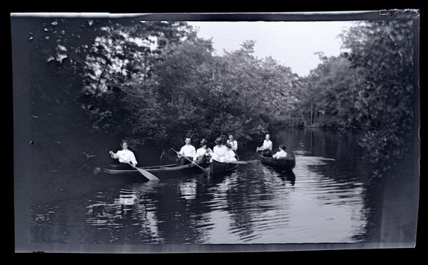 Film negative showing four canoes holding two people each traveling down Rancocas Creek. Trees line the riverbank with their branches extending over the water. The Rancocas Creek is a tributary of the Delaware River located in south-west New Jersey.