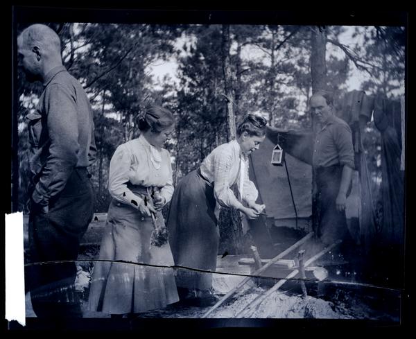 Film negative showing two men and two women making a campfire near the Egg Harbor River. The women wear long skirts, blouses, and ribbons around their necks. The men wear dark pants and shirts. A tent is visible in the background.
