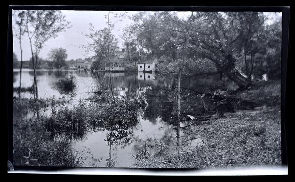 Film negative showing a view of a river. Trees and other foliage line the river and buildings stand near the water in the distance.