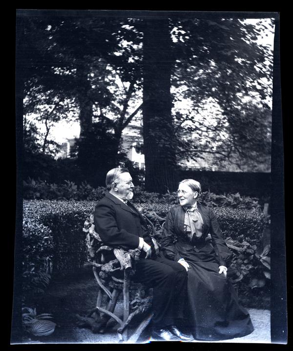 Film negative showing Marriott C. Morris' older parents Elliston P. Morris and Martha Canby Morris seated on a wooden bench looking at each other. Elliston Morris wears a three piece suit while Martha Morris wears a long black dress with a ruffled blouse and glasses. A manicured hedge and large trees stand behind the bench.