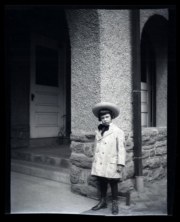 Film negative showing Marriott C. Morris' son Marriott Canby Morris Jr. as a boy wearing a coat and hat standing next to the back porch of their home at 6706 Cresheim Road. A stone archway stands behind Morris, who wears a coat, wide-brimmed hat, and ribbon around his neck.