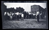 Film negative showing a group of men and boys gathered in a field at the Germantown Boys' Club around a rope strung across the center. Many of the boys wear suspenders and hats. Founded in 1887, the Boys’ Parlors Association of Germantown served as a safe space for neighborhood children whose parents worked longer hours in an industrializing city. The name changed in 1907 to the Germantown Boys’ Club after joining ranks with the Boys and Girls Clubs of America. Marriott Canby Morris served as the president of the club in the first decade of the 1900s.