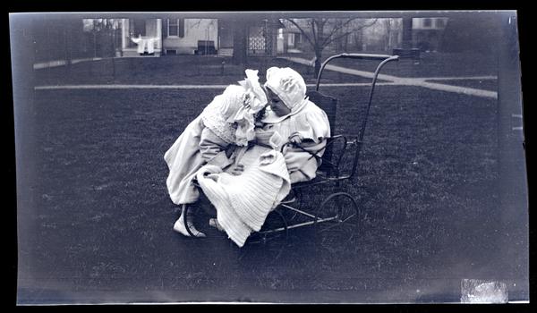 Film negative showing a young child wearing a ruffled hat leaning in to look closely at a baby sitting in a pram, probably in Philadelphia. Garden paths and a house are visible behind the children.