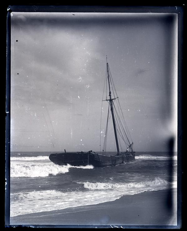 Glass negative showing the A.M.S. Taunton, a sailing ship with a tall mast moored in shallow water near the shore at Sea Girt. Waves crash around the ship onto the sand in the foreground.