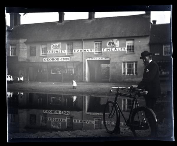 Film negative likely taken during Marriott C. Morris’ European honeymoon showing a man standing next to a bicycle on a dirt road in front of the George Inn. The two-story inn has signs reading "Cebonsey Harman Fine Ales," "George-Inn," and "Good Stabling." The man has a beard and mustache and wears a three-piece suit and hat. A large puddle blocks part of the road and a child walks down the street in front of the building. More children gather near the building to the left.
