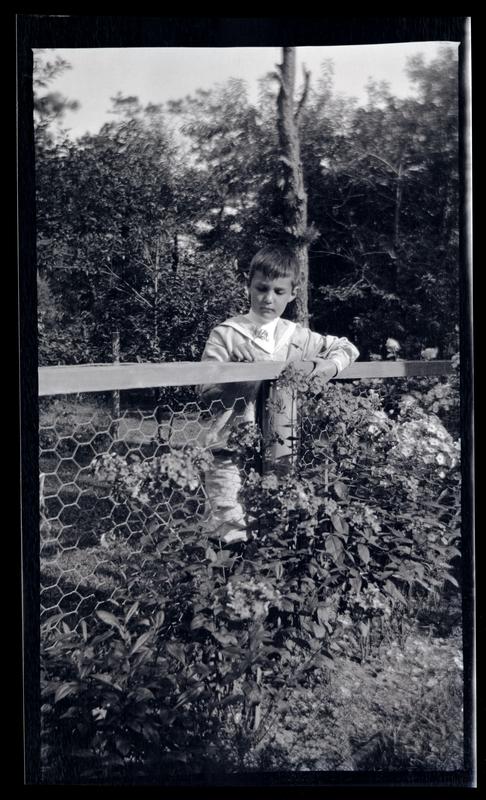 Film negative showing Marriott C. Morris' son Elliston P. Morris Jr. as a boy standing next to a chicken wire fence. He wears a sailor suit and looks down at his hand resting on top of the fence. Flowering shrubs grow on the opposite side of the fence and trees grow in the background.