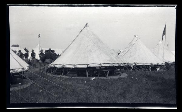 Film negative showing a group of tents arranged in rows at Sea Girt. Two flagpoles are visible between the tents and a group of men in uniforms gathers in the center.
