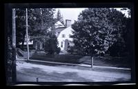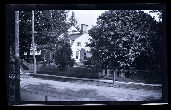 Film negative showing a view of Sarah and Rebecca Nicholsons' house seen from across the street at Marriott C. Morris' aunt Beulah Rhoads' home at Haddonfield. Trolley tracks line the road. A fence stands between the house and the road and trees grow in the lawn. The Haddonfield area was originally developed by Elizabeth Haddon (1680-1762) who immigrated to the United States in 1701 to manage property her father had bought in the colonies.