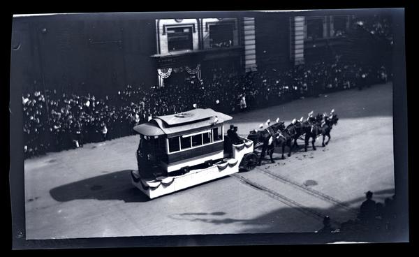 Film negative showing a parade float pulled by four horses during the 225th Anniversary parade of Germantown. The float carries three men and a replica of a trolley. Crowds gather on either side of the street to watch the parade. The Bicentennial anniversary parade celebrated the first German immigrants to America and the first thirteen Quaker families who founded Germantown. Most of the events were actually held in Philadelphia, and included the parade, concerts, religious services, and a ball. A smaller annual holiday, German Day, began to be held in subsequent years in German-American communities.