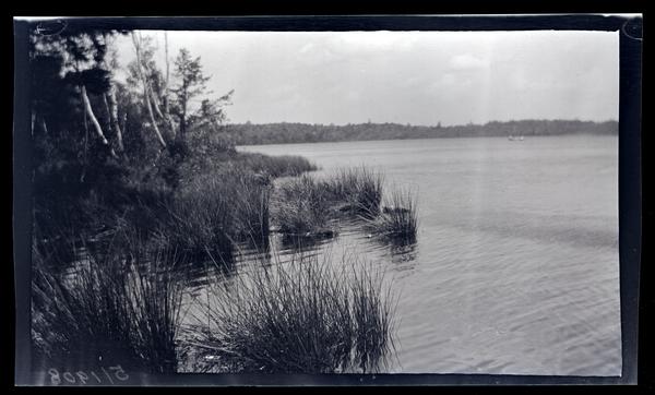 Film negative showing a view of the lake at Pocono Lake lined with trees. Reeds grow in the shallow water in the foreground. The Pocono Lake Preserve was pioneered by a group of Quakers, including Isaac Sharpless, who camped in the area in 1904. In 1908, this group bought the property from the Pocono Mountain Ice Company and designed it as a basic, rustic campground.