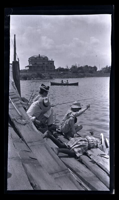 Film negative showing a group of adults and children fishing off the side of a wooden dock at Sea Girt. One child lays on their stomach and leans out over the water. The other child holds a string with bait over the water. Two people paddle a canoe to the right of the dock and a large building stands on the shore.