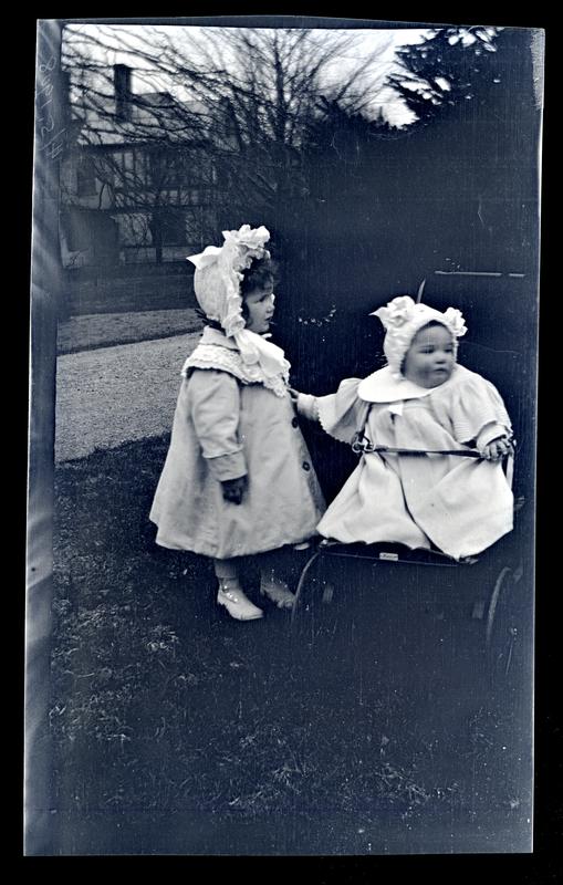 Film negative showing a child standing next to a baby sitting in a pram in a garden. Both children wear dresses and hats decorated with ribbons. A house is visible in the distance.