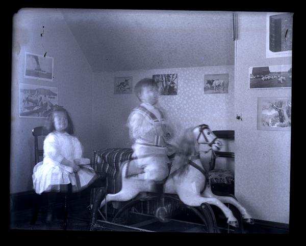 Glass negative showing a view of a child's playroom with Marriott C. Morris' sons Elliston Perot Morris Jr. riding a rocking horse and Marriott Canby Morris Jr. seated in a chair on the left. Another chair sits on the right and the walls are filled with pictures of animals.