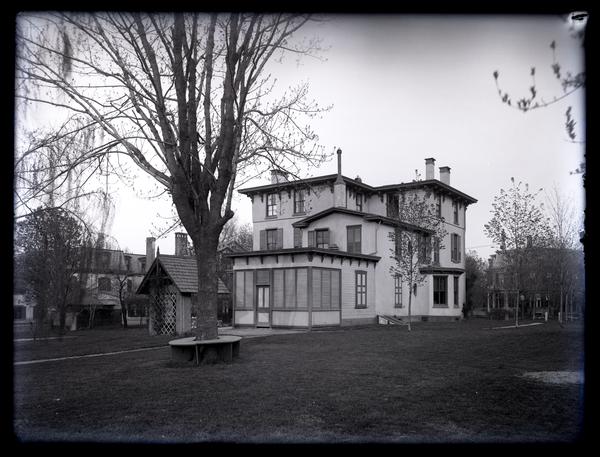 Glass negative showing a rear view of Marriott C. Morris' house at 131 West Walnut Lane. The three-story house feaatures a sunroom with large, shuttered windows and a small shed in the backyard. A tree surrounded by a circular wooden bench stands in the lawn behind the house next to a path leading to the sunroom.