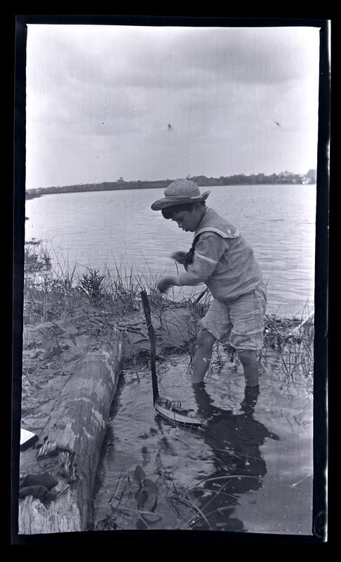 Film negative showing Marriott C. Morris' son Marriott Canby Morris Jr. as a boy wading in Wreck Pond with a toy boat floating near his ankles. He wears a straw hat and a sailor suit.