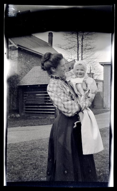 Film negative showing Marriott C. Morris' wife Jane Morris holding their daughter Janet Morris as a baby in the yard at their home at 131 W. Walnut Lane. Jane Morris wears a checkered shirt and black skith. Janet Morris smiles and wears a cap and a long frock.