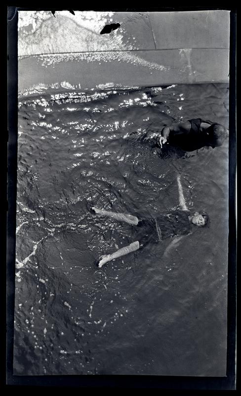 Film negative showing a man and boy swimming in a pool at Sea Girt. The boy floats while the man stands in the water. The swimmers are seen from above.