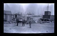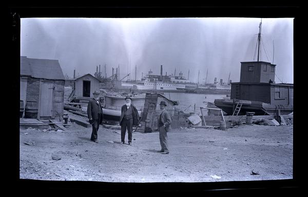Film negative showing three men, including Marriott C. Morris' father Elliston P. Morris, standing in a dockyard at the foot of Snyder Avenue. Debris and rowboats line the shore while a large steamship is docked in the background. The men wear three-piece suits and hats.