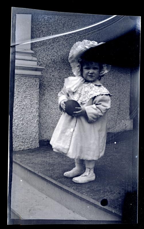 Film negative showing a child standing on a porch holding a ball. The child wears a dress with a lace collar and a ruffled hat.