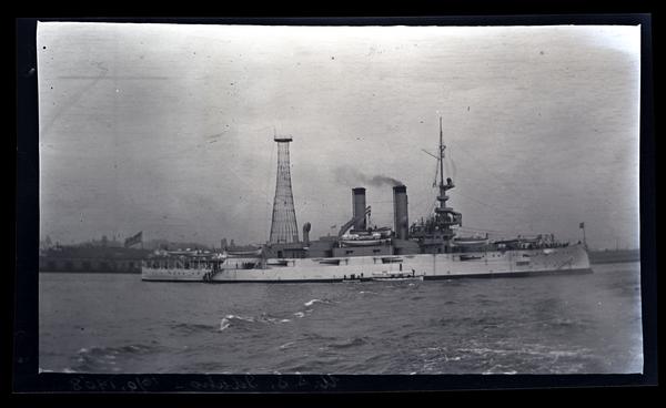 Film negative showing a view of a large steam ship seen from across the water at Egg Harbor. An American flag flies from the stern of the ship.