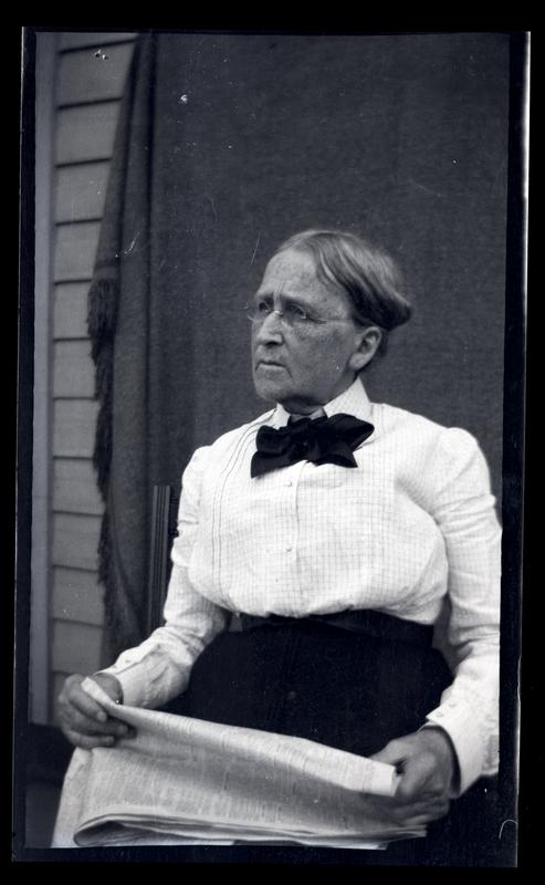 Film negative showing Marriott C. Morris' mother Martha Canby Morris seated on a porch holding a newspaper. She wears round glasses, a white patterned blouse, and a dark ribbon around her neck.