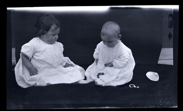 Film negative showing Marriott C. Morris' daughter Janet Morris and niece Sarah Rhoads Potts as babies each wearing white frocks sitting on a blanket in front of a dark backdrop. A pacifier and a shell sit on the blanket to the right.