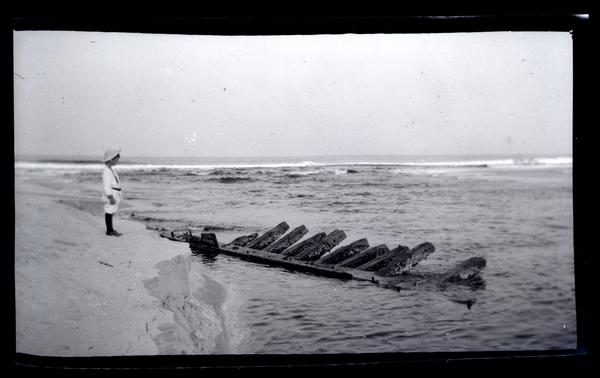 Film negative showing a boy, possibly Marriott C. Morris's son Marriott C. Morris Jr., standing on the shore near the ocean at Sea Girt and looking down at a large pile of driftwood in the water. The sand drops off steeply into the waves.