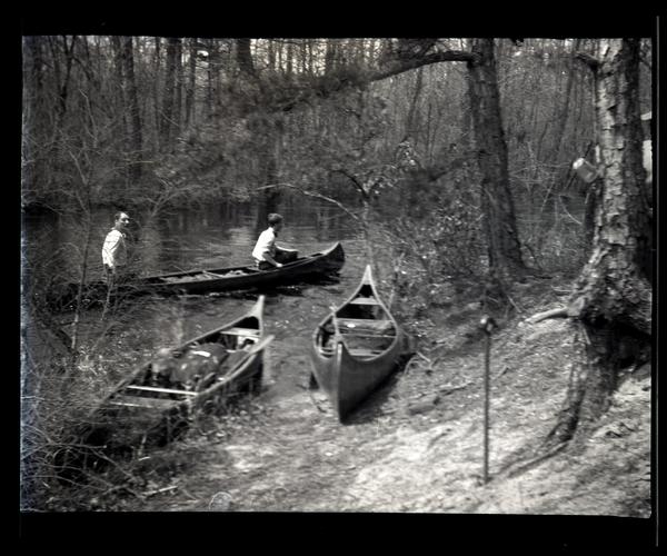 Film negative showing two men in a canoe traveling down Egg Harbor river. Two other canoes sit on the riverbank next to trees with exposed roots.