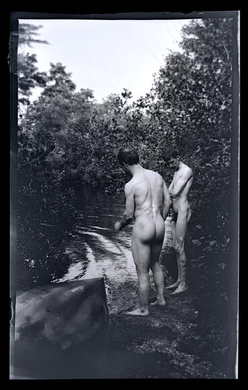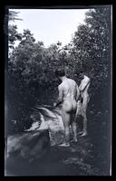 Film negative showing two nude men standing on the shore of Rancocas Creek. An overturned canoe rests to the left. The Rancocas Creek is a tributary of the Delaware River located in south-west New Jersey.