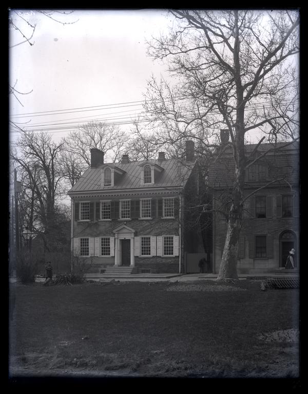 Glass negative showing a view the Deshler-Morris House with shuttered windows, multiple chimneys, and two gabled windows on the roof at 5442 Germantown Avenue. The house is seen from across Market Square with a large tree growing on the right side. A child stands in the park on the left while a woman stands in the doorway of the neighboring house. David Deshler built the original four-room summer cottage on this Germantown lot in 1752, adding the three-story front addition in 1772. The house was sold to Col. Isaac Franks in 1792 after Deshler’s death. President George Washington rented the home for the duration of the yellow fever epidemic of 1793 and the summer of 1794. Elliston and John Perot purchased the house in 1804, selling it to Elliston’s son-in-law Samuel B. Morris after his death in 1834. The house stayed in the possession of the Morris family for over a century, when Elliston P. Morris donated the house to the National Parks Service in 1948. The name was officially changed to the Germantown White House in 2009.