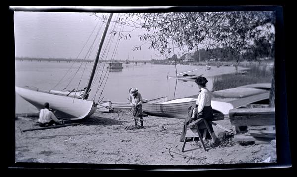 Film negative showing three people on the shore at Wreck Pond. Rowboats and a sailboat rest in the sand and a causeway is visible in the background.